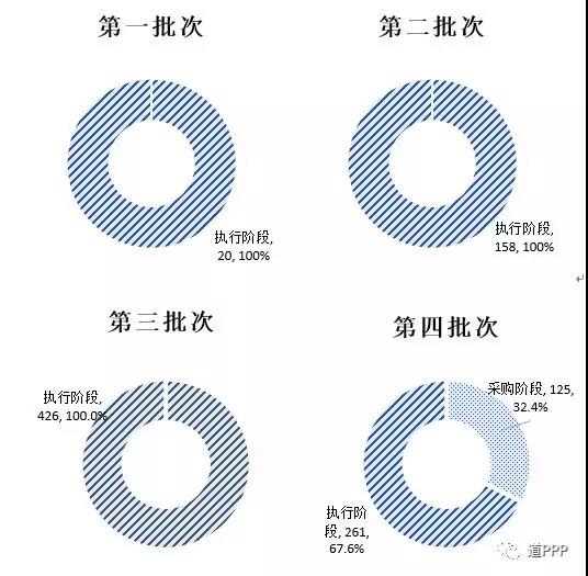 第一批20個(gè)示范項(xiàng)目自2016年底以來(lái)、第二批158個(gè)示范項(xiàng)目自2017年3月以來(lái)、第三批426個(gè)示范項(xiàng)目自2018年3月以來(lái)均已100%落地。第四批示范項(xiàng)目中落地項(xiàng)目261個(gè),落地率67.6%。四批示范項(xiàng)目各自落地率如圖2-2-2。