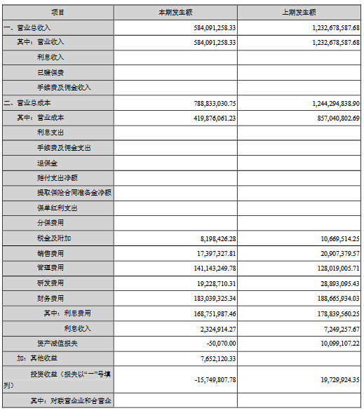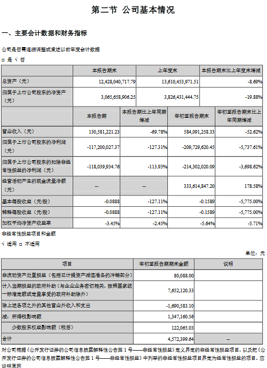 公告顯示,公司前三季度營(yíng)業(yè)收入584,091,258.33元,同比減少52.62%,歸屬上市公司股東的凈利潤(rùn)-209,729,620.45元,同比減少5737.61%。
