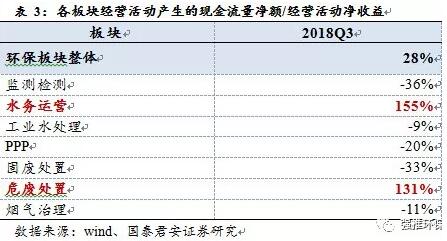 經(jīng)營(yíng)現(xiàn)金流凈額方面:2018前三季度,環(huán)保行業(yè)整體凈額為55.9億元,受益于水務(wù)運(yùn)營(yíng)與危廢處置板塊,現(xiàn)金流超前于收入確認(rèn)的行業(yè)屬性,其他板塊,現(xiàn)金流與收入的匹配性仍有待提高。