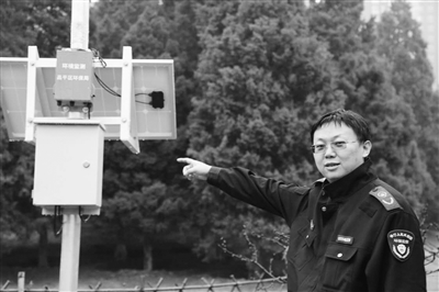 昌平區(qū)環(huán)保局工作人員手指的盒子就是“微站”的核心部件。設(shè)置在昌平公園內(nèi)的這個(gè)實(shí)時(shí)監(jiān)控PM2.5和PM10兩個(gè)因子的微型監(jiān)測站,可以實(shí)現(xiàn)每一分鐘向系統(tǒng)上傳一次數(shù)據(jù)。 本報(bào)記者童克難攝