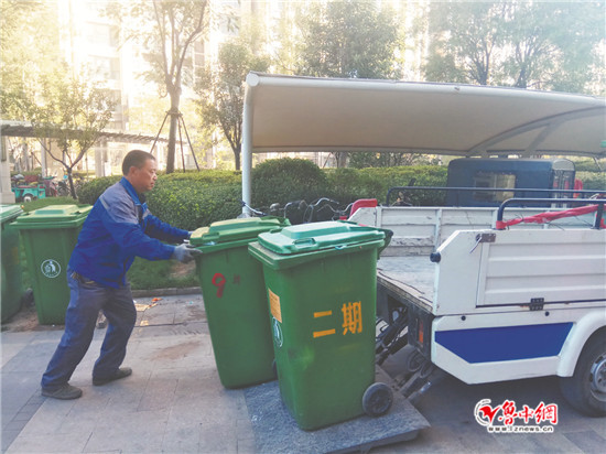 5日早晨7點10分,桓臺東岳國際9號樓1單元的居民王女士把一袋垃圾提到樓下,扔進了樓前的垃圾桶。第一個處理這袋垃圾的人,是東岳國際物業(yè)的保潔馬師傅。每天早上7點30分上班后,馬師傅和同事開著一輛專用的四輪電動車,把垃圾桶從居民樓前運到小區(qū)外面的臨時垃圾存放點。東岳國際小區(qū)有23棟樓,每個單元前面都擺著兩三個垃圾桶。馬師傅他們上午要拉四趟,下午拉一趟就可以了,“住在這個小區(qū)里的年輕人多,白天都上班了,產(chǎn)生的垃圾也少?!瘪R師傅告訴記者。