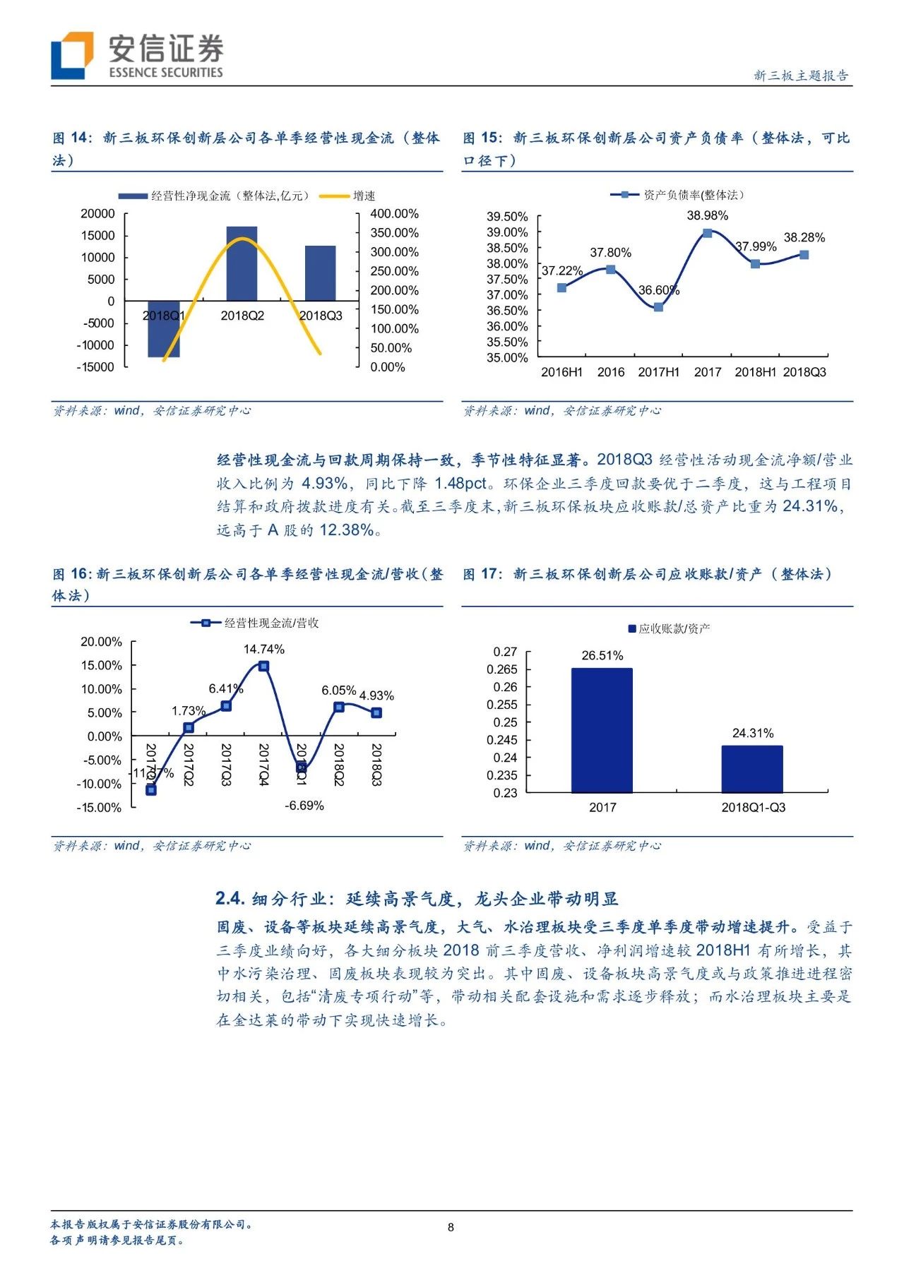 經(jīng)營水平:截至2018年三季度末,新三板創(chuàng)新層環(huán)保板塊資產(chǎn)負(fù)債率為38.28%,遠(yuǎn)低于A股環(huán)保板塊的56.85%,主要原因是A股環(huán)保企業(yè)依托PPP模式,且2014年-2017年的大力推廣期,資產(chǎn)負(fù)債率呈現(xiàn)明顯上升,進(jìn)入加杠桿周期,而PPP項目對于新三板環(huán)保板塊影響較小。經(jīng)營性現(xiàn)金流與回款周期保持一致,季節(jié)性特征顯著。2018Q3經(jīng)營性活動現(xiàn)金流凈額/營業(yè)收入比例為4.93%,同比下降1.48pct。環(huán)保企業(yè)三季度回款要優(yōu)于二季度,這與工程項目結(jié)算和政府撥款進(jìn)度有關(guān)。截至三季度末,新三板環(huán)保板塊應(yīng)收賬款/總資產(chǎn)比重為24.31%,遠(yuǎn)高于A股的12.38%,主要與新三板環(huán)保企業(yè)議價能力有關(guān)。