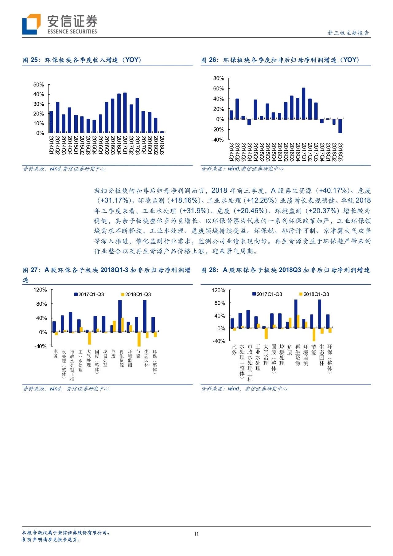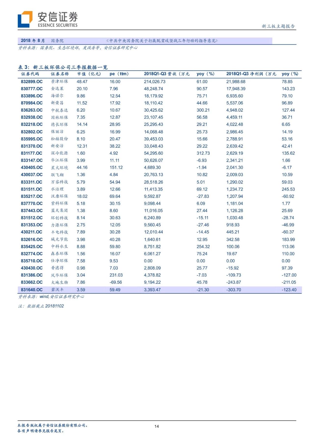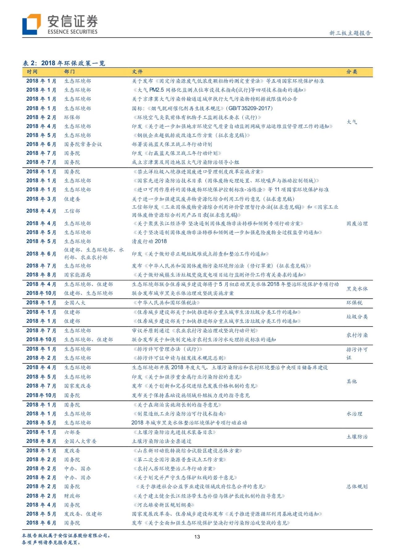 從政策進(jìn)展看環(huán)境變遷路徑,環(huán)境治理已經(jīng)實現(xiàn)圍繞大氣+水+土壤三大維度建立起“環(huán)保稅+排污許可證”兩大保障、從城市走向農(nóng)村的一體化大環(huán)保格局。自年初環(huán)保稅、排污許可證實施以來,政策力度不減且頻頻出臺,在肯定我國環(huán)境治理已取得階段性的勝利的同時,進(jìn)行大氣、水、固廢、土壤等細(xì)分領(lǐng)域的深化推進(jìn)。我們對于2018年以來各細(xì)分板塊政策及變遷進(jìn)行了梳理。而新三板擁有400家公司,覆蓋了大氣治理、水治理、固廢治理等各個領(lǐng)域。我們繼續(xù)看好環(huán)保板塊,建議從政策推進(jìn)進(jìn)程中發(fā)掘潛在機(jī)會,建議關(guān)注水治理、固廢治理和再生資源板塊投資機(jī)會。