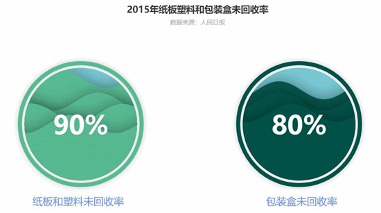 與高消耗量形成鮮明對比的是極低的回收率。2015年,紙板和塑料的實(shí)際未回收率大于90%,包裝物總體未回收率大于80%。