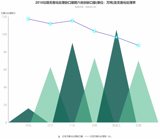 從下圖我們還可以得知,盡管我國的垃圾無害化處理率相當(dāng)高,基本在70%以上,但由于垃圾清運(yùn)量龐大,垃圾缺口量依舊龐大(缺口量為垃圾清運(yùn)量減去垃圾無害化處理量)。其中黑龍江缺口量達(dá)105萬噸,廣東缺口量達(dá)90.3萬噸。這些未經(jīng)無害化處理的垃圾是環(huán)境污染的重要源頭。