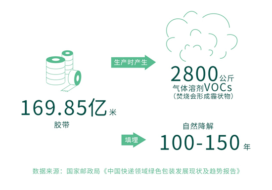 《中國快遞領(lǐng)域綠色包裝發(fā)展現(xiàn)狀及趨勢報告》顯示,2015 年 400 多萬噸包裝垃圾中,消耗編織袋約 31 億條、塑料袋約 82.68 億個、封套約 31.05 億個、包裝箱約 99.22 億個、膠帶約 169.85 億米、內(nèi)部緩沖物約 29.77 億個。而這些膠帶在生產(chǎn)過程中,會產(chǎn)生 2800 公斤氣體溶劑 VOCs(焚燒會形成霾狀物),如果填埋處理,實(shí)現(xiàn)自然降解需要 100-150 年。