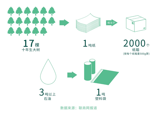 快遞包裝以紙張、塑料等形式為主,其原材料大多源于木材、石油等。根據(jù)相關(guān)專家測算,生產(chǎn)1噸紙需砍伐17棵十年生大樹,生產(chǎn)1噸塑料袋需消耗3噸以上石油。回收率低也就意味著浪費(fèi)生產(chǎn)資源。中國快遞協(xié)會副秘書長楊駿說,每年由快遞包裹帶來的包裝廢棄物達(dá)到百萬噸。
