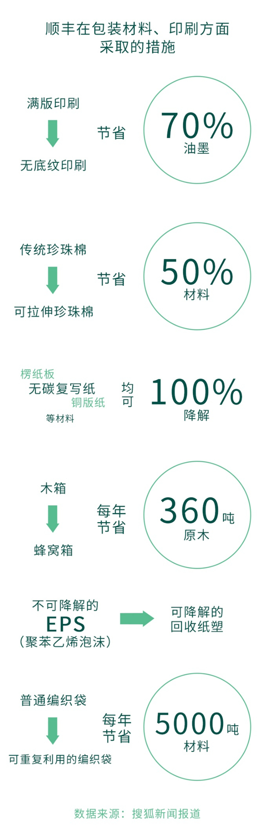 例如順豐在包裝材料、印刷方面,將滿版印刷改為無底紋印刷,可以節(jié)省油墨用量70%;利用可拉伸珍珠棉代替?zhèn)鹘y(tǒng)珍珠棉,節(jié)省材料50%;在環(huán)保材料方面,使用的楞紙板、無碳復(fù)寫紙、銅版紙等材料均可100%降解,還使用蜂窩箱代替木箱包裝,每年可節(jié)約原木360噸;利用可降解的回收紙塑代替不可降解的EPS(聚苯乙烯泡沫)材料;除此之外,使用可重復(fù)利用的編織袋代替普通編織袋,每年可節(jié)省材料5000多噸。
