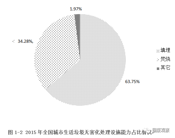 2015年全國城市生活垃圾無害化處理設(shè)施達到890座,無害化處理量為18013.01萬噸,比上一年分別增長8.8%和9.88%。衛(wèi)生填埋、焚燒依舊是我國采用的垃圾無害化處理兩種主要方式。其中,衛(wèi)生填埋640座,比上一年增加36座,無害化年處理量為11483.14萬噸,比上一年增加6.88%。生活垃圾焚燒廠220座,比上一年增加32座,無害化年處理量為6175.52萬噸,比上一年大幅增加15.87%。其他類型處理設(shè)施30座,比上一年增添4座,無害化年處理量為354.35萬噸,比2014年增加10.88%。填埋、焚燒分別占總無害化處理量的63.74%、34.28%,“十二五”期間,填埋處理總量比例持續(xù)小幅下降,焚燒廠數(shù)量和處理能力持續(xù)保持明顯上升,其他類型處理方式一直未有突破性發(fā)展。