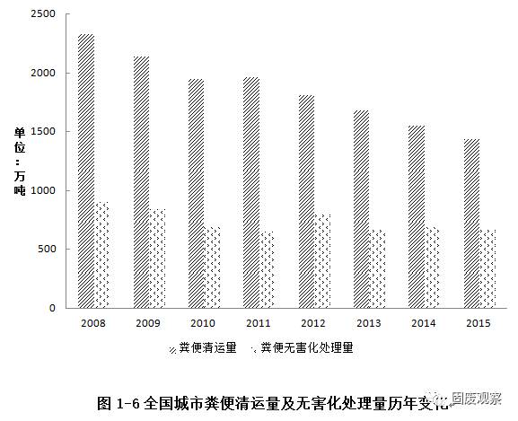 2015年全國城市共清運糞便1436.77萬噸,無害化處理量673.67萬噸,無害化處理率為46.89%。清運量較2014年繼續(xù)保持下降,但無害化處理率繼續(xù)保持上升,較上一年增加2.30%。