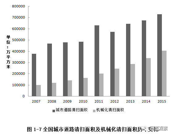 2015年全國城市道路清掃面積730333萬平方米,其中機械化清掃面積405569萬平方米,占全部清掃面積55.53%。全國城市道路清掃面積累計比2014年增加8%,機械化清掃面積比2014年增長18.9%,道路機械清掃作業(yè)率繼續(xù)顯著提高。