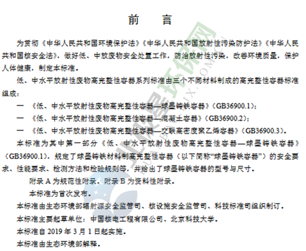 為貫徹《中華人民共和國環(huán)境保護(hù)法》《中華人民共和國放射性污染防治法》《中華人民共和國核安全法》,防治放射性廢物污染,保障人體健康,現(xiàn)批準(zhǔn)《低、中水平放射性固體廢物包安全標(biāo)準(zhǔn)》《低、中水平放射性廢物高完整性容器——球墨鑄鐵容器》《低、中水平放射性廢物高完整性容器——混凝土容器》《低、中水平放射性廢物高完整性容器——交聯(lián)高密度聚乙烯容器》等4項(xiàng)標(biāo)準(zhǔn)為國家放射性污染防治標(biāo)準(zhǔn),并由生態(tài)環(huán)境部與國家市場監(jiān)督管理總局聯(lián)合發(fā)布。