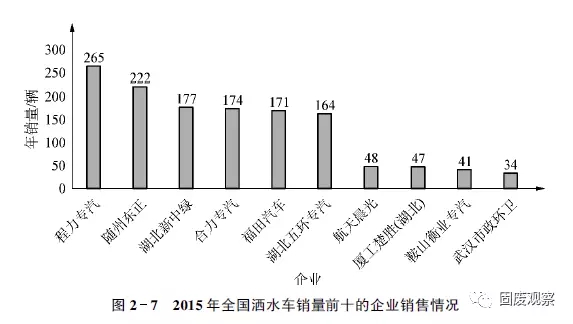 2015年,全國灑水車銷量前10企業(yè)合計銷售灑水車6462輛,同比增長3.54%,市場份額84.01%,同比提升8.63%。其中,程力專汽是2015年全國灑水車銷售企業(yè)中唯一一家灑水車?yán)塾嬩N量超過2000輛且在2400輛以上的企業(yè),同比增長在12%以上,市場份額在31%以上,同比提升5.49%。東風(fēng)集團(tuán)排名第二,累計銷量1409輛,市場份額在18%以上。隨州東正累計銷量超過600輛,市場份額近8%,排名第3。其余企業(yè)累計銷量均在500輛以下。