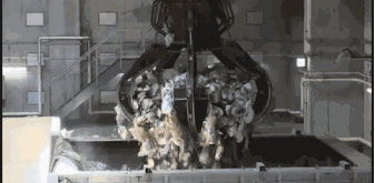 機械手把垃圾混合均勻后,可燃的垃圾被大爪子抓起來放進燃燒爐。