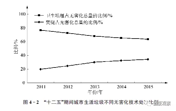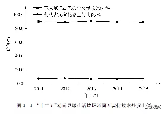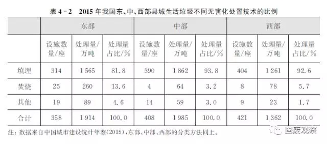由表4-2可知,2015年我國東部地區(qū)填埋比例是81.8%,中部和西部地區(qū)填埋比例更高,分別是93.8%和92.6%,表明填埋仍然在縣城區(qū)域垃圾處理中占據(jù)著絕對(duì)主力位置。