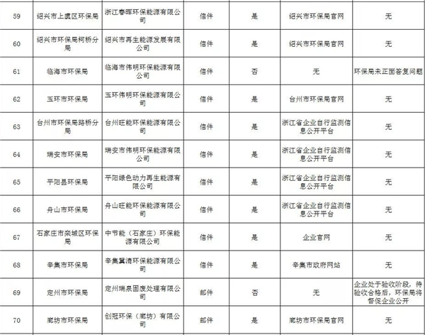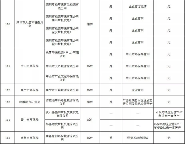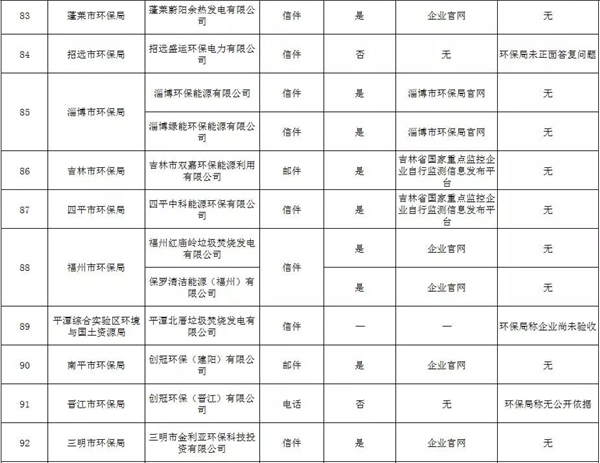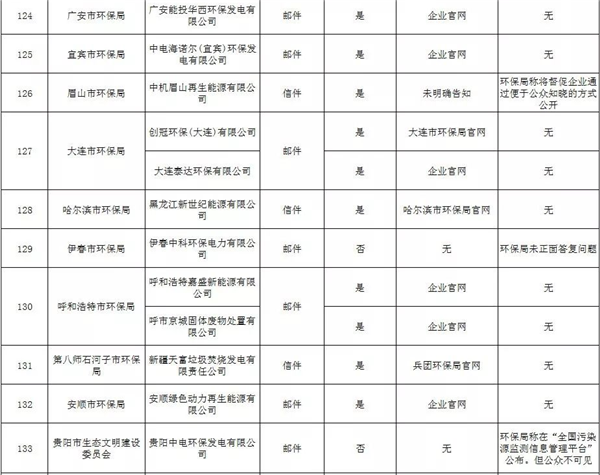 在此次回復(fù)中,有5個環(huán)保部門未正面回復(fù)履職申請,分別是昆山市環(huán)保局、臨海市環(huán)保局、招遠(yuǎn)市環(huán)保局、秦皇島市環(huán)保局、伊春市環(huán)保局。如昆山市環(huán)保局稱“昆山鹿城垃圾發(fā)電有限公司列入蘇州市2018年大氣環(huán)境重點排污單位,未列入蘇州市2018年土壤環(huán)境重點排污單位?!?;臨海市環(huán)保局稱“飛灰送往松山垃圾填埋場。飛灰固化塊上均貼有危險廢物標(biāo)簽,轉(zhuǎn)移過程使用電子聯(lián)單,并按時保送至環(huán)保局備案,可以在臺州市危險廢物和污泥全過程監(jiān)控系統(tǒng)中追溯?!保刺峒帮w灰監(jiān)測報告及去處的公開情況。