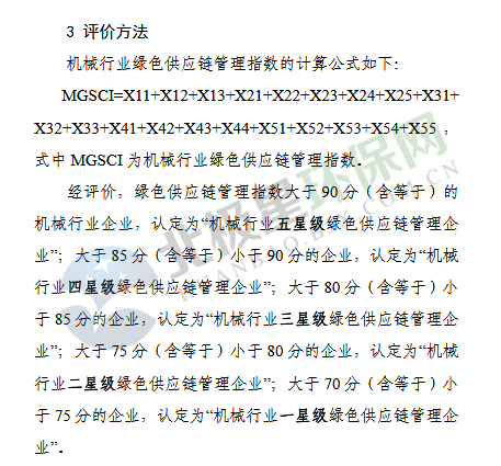 11月23日《機(jī)械行業(yè)綠色供應(yīng)鏈管理企業(yè)評(píng)價(jià)指標(biāo)體系》、《汽車(chē)行業(yè)綠色供應(yīng)鏈管理企業(yè)評(píng)價(jià)指標(biāo)體系》及《電器電子行業(yè)綠色供應(yīng)鏈管理企業(yè)評(píng)價(jià)指標(biāo)體系》公示征求意見(jiàn),具體內(nèi)容如下: