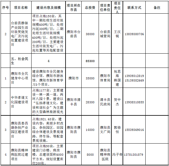 社會(huì)民生領(lǐng)域項(xiàng)目4個(gè),總投資85300萬元,主要包括濮陽市全民健身中心項(xiàng)目、中華孝道文化園建設(shè)項(xiàng)目、濮陽縣婁昌湖雜技產(chǎn)業(yè)園區(qū)建設(shè)項(xiàng)目、濮陽縣精神病醫(yī)院遷建項(xiàng)目。關(guān)注微信 濮陽全攻略 領(lǐng)紅包