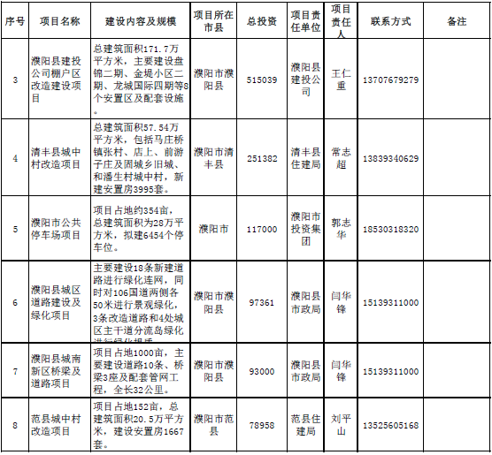 城市建設(shè)領(lǐng)域項(xiàng)目11個(gè),總投資2564340萬元,主要包括濮陽市公共停車場項(xiàng)目、濮陽市旅游集散中心建設(shè)項(xiàng)目、濮陽縣城投公司棚戶區(qū)改造建設(shè)項(xiàng)目、清豐縣城中村改造項(xiàng)目等。