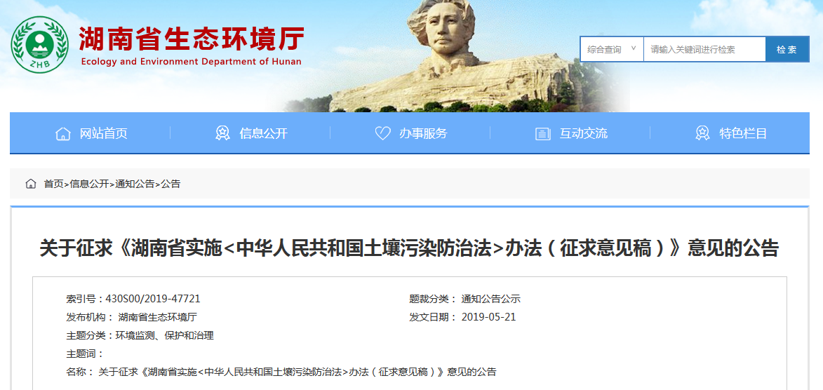 近日,湖南省生態(tài)環(huán)境廳發(fā)布《湖南省實(shí)施<中華人民共和國(guó)土壤污染防治法>辦法(征求意見稿)》,詳情如下:根據(jù)省人大立法計(jì)劃,我廳組織起草了《湖南省實(shí)施<中華人民共和國(guó)土壤污染防治法>辦法(征求意見稿)》(見附件)。為提高立法質(zhì)量,現(xiàn)公開征求意見,請(qǐng)將修改意見通過(guò)傳真或電子郵件等...