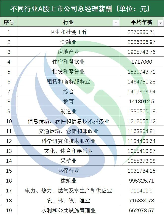 2021年約有4800家A股上市公司發(fā)布年報(bào),但由于總經(jīng)理由董事長(zhǎng)兼任等情況,萬(wàn)得資訊(wind)僅收錄了2907份總經(jīng)理年薪數(shù)據(jù)。中國(guó)水網(wǎng)將其中的126家環(huán)保類公司總經(jīng)理年薪數(shù)據(jù)剝離出來(lái),并參考證監(jiān)會(huì)的行業(yè)分類,將剩余的企業(yè)分為了金融業(yè)、房地產(chǎn)業(yè)、制造業(yè)等18個(gè)行業(yè),加上環(huán)保行業(yè),共計(jì)19個(gè)行業(yè),...