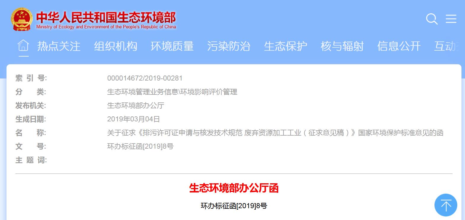 關(guān)于征求《排污許可證申請與核發(fā)技術(shù)規(guī)范 廢棄資源加工工業(yè)(征求意見稿)》國家環(huán)境保護(hù)標(biāo)準(zhǔn)意見的函生態(tài)環(huán)境部辦公廳函環(huán)辦標(biāo)征函[2019]8號關(guān)于征求《排污許可證申請與核發(fā)技術(shù)規(guī)范 廢棄資源加工工業(yè)(征求意見稿)》國家環(huán)境保護(hù)標(biāo)準(zhǔn)意見的函各有關(guān)單位:為落實(shí)《國務(wù)院辦公廳關(guān)于印發(fā)控制污染物排放許可制實(shí)施...