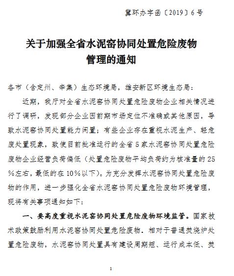 近日,河北省生態(tài)環(huán)境廳辦公室發(fā)布了關于加強全省水泥窯協(xié)同處置危險廢物管理的通知,對水泥窯協(xié)同處置危險廢物環(huán)境管理做出明確指示,詳情如下:延伸閱讀:貴州:加快發(fā)展垃圾發(fā)電 推廣水泥窯協(xié)同處置城市垃圾(附重點任務)