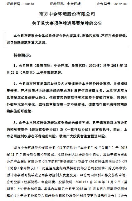 中金環(huán)境11月22日晚間公告,公司實(shí)際控制人沈金浩擬將1.28億股股份(占公司總股本的6.65%)轉(zhuǎn)讓給無(wú)錫市政,轉(zhuǎn)讓價(jià)格為4.42元/股,交易作價(jià)5.65億元。此外,沈金浩擬通過(guò)表決權(quán)委托方式將剩余股份中2.33億股股份對(duì)應(yīng)的表決權(quán)委托給無(wú)錫市政,占公司總股本的12.13%。交易完成后公司控股股東...