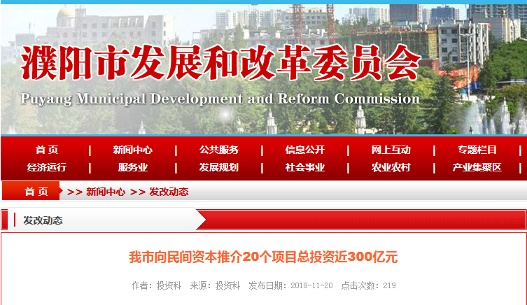 11月16日,河南省召開2018年向民間資本推介項(xiàng)目會(huì)議。會(huì)上,我市向民間資本推介了重點(diǎn)領(lǐng)域20個(gè)項(xiàng)目,總投資299.04億元,分別占全省的9.17%、11.4%。從項(xiàng)目具體情況看,這批推介項(xiàng)目涵蓋了交通、水利、城市建設(shè)、生態(tài)環(huán)保、社會(huì)民生等五個(gè)方面。關(guān)交通領(lǐng)域項(xiàng)目1個(gè),總投資43160萬(wàn)元,主要建...