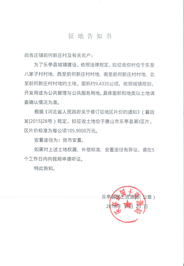日前唐山樂亭縣政府發(fā)布了《樂亭縣固廢綜合處理廠生活垃圾焚燒發(fā)電項(xiàng)目建設(shè)用地征地告知書》,該告知書顯示擬征收樂亭縣閻各莊鎮(zhèn)前何新莊村位于東至八家子村村地、西至前何新莊村村地、南至前何新莊村村地、北至前何新莊村村地的土地,面積約9.4335公頃。具體內(nèi)容如下: