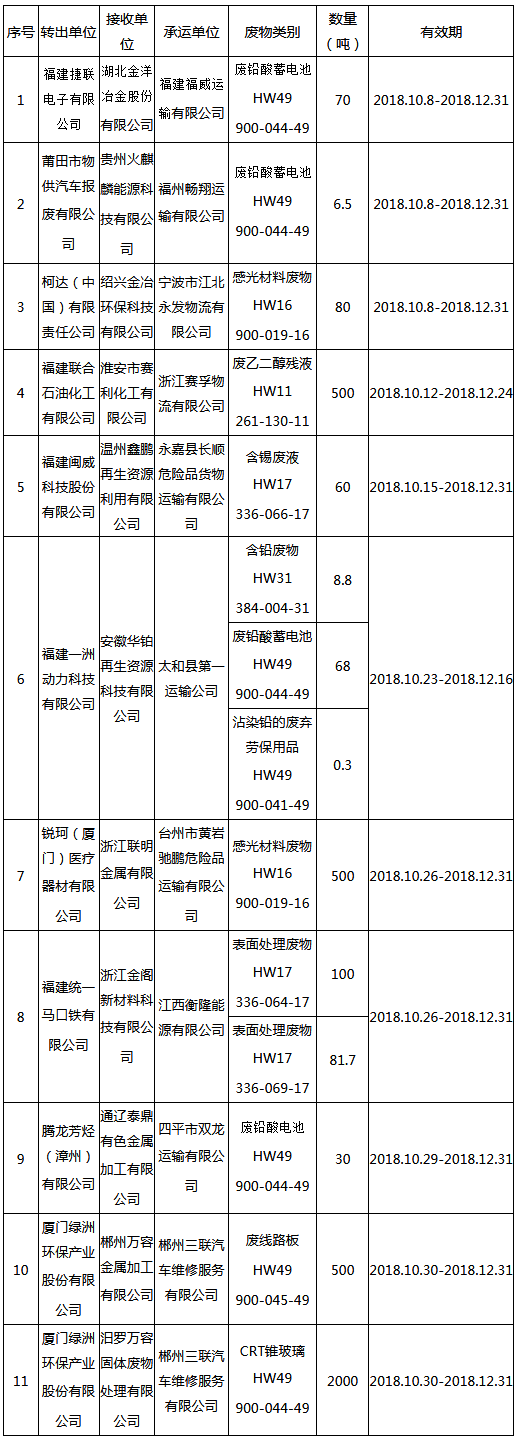 日前福建省環(huán)境保護(hù)廳發(fā)布了《2018年10月福建省危險(xiǎn)廢物跨省轉(zhuǎn)移情況公告》,共有11項(xiàng),具體內(nèi)容如下: