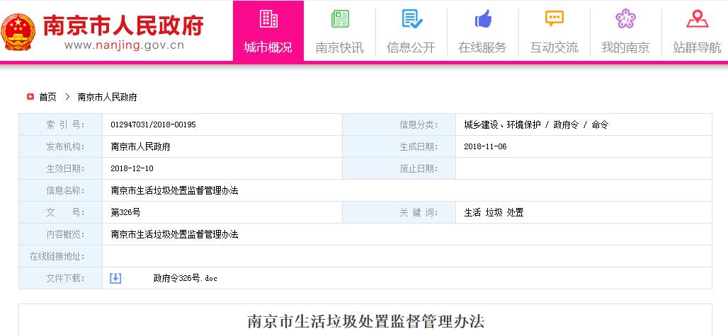 《南京市生活垃圾處置監(jiān)督管理辦法》日前公布,詳情如下:南京市生活垃圾處置監(jiān)督管理辦法第326號(hào)《南京市生活垃圾處置監(jiān)督管理辦法》已經(jīng)2018年10月31日市政府第23次常務(wù)會(huì)議審議通過,現(xiàn)予公布,自2018年12月10日起施行。市長(zhǎng):藍(lán)紹敏2018年11月6日南京市生活垃圾處置監(jiān)督管理辦法第一章 總...