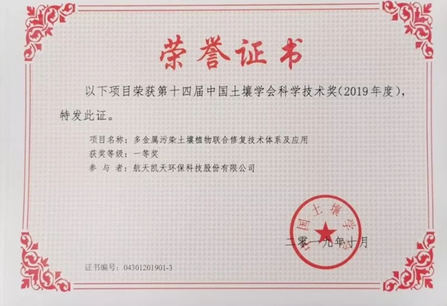 2019年10月,經(jīng)中國(guó)土壤學(xué)會(huì)項(xiàng)目評(píng)選委員會(huì)評(píng)審決定,航天凱天環(huán)??萍脊煞萦邢薰九c中山大學(xué)、廣東省耕地肥料總站聯(lián)合申報(bào)的“多金屬污染土壤植物聯(lián)合修復(fù)技術(shù)體系及應(yīng)用”獲中國(guó)土壤學(xué)會(huì)科學(xué)技術(shù)獎(jiǎng)一等獎(jiǎng)。 該技術(shù)體系將航天凱天環(huán)保自主研發(fā)的重金屬土壤修復(fù)技與中山大學(xué)研發(fā)的多金屬污...