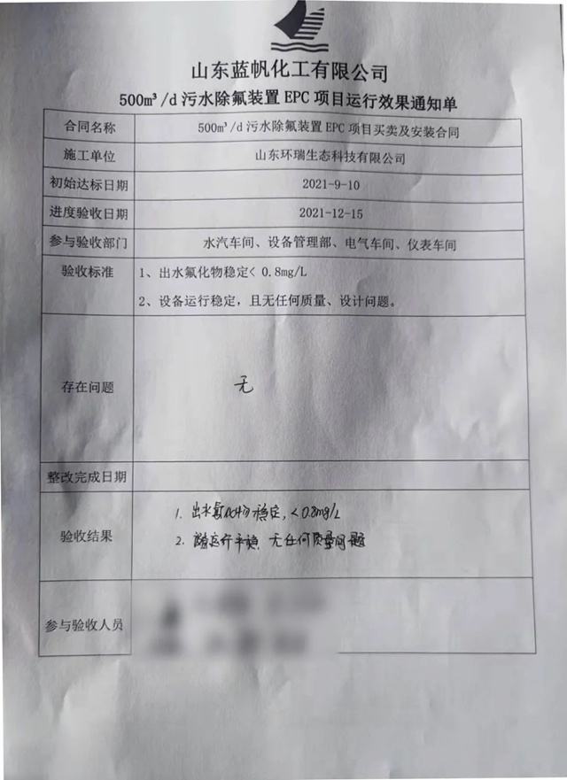 2021年12月15日,環(huán)瑞生態(tài)深度除氟<0.8mg/L項目——《藍(lán)帆化工煤造氣廢水深度除氟項目》順利通過竣工驗(yàn)收! 項目運(yùn)行效果通知單 經(jīng)過三個月的艱苦奮戰(zhàn),順利完工驗(yàn)收,系統(tǒng)連續(xù)運(yùn)行三個月出水完全達(dá)標(biāo),出水氟離子濃度穩(wěn)定<0.8mg/L,且無裝置設(shè)備運(yùn)行質(zhì)量問...