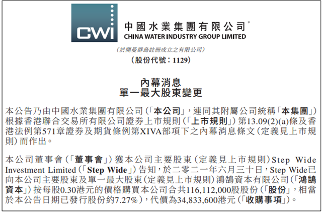 2021年7月5日,中國水業(yè)集團(tuán)有限公司發(fā)布公告稱: 接Step Wide Investment Limited通知,2021年6月30日,Step Wide已向中國水業(yè)集團(tuán)單一最大股東鴻鵠資本有限公司按每股0.30港元的價(jià)格購買中國水業(yè)集團(tuán)合共116,112,000股股份(相當(dāng)于本公告日期已發(fā)行股...