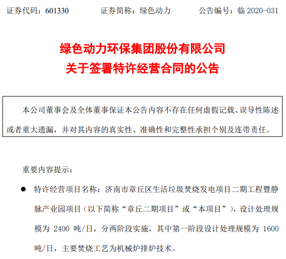 綠色動力環(huán)保6月3日公布一則關(guān)于簽署特許經(jīng)營合同的公告,公告顯示綠色動力與濟南市章丘區(qū)環(huán)境衛(wèi)生管護(hù)中心簽署《章丘區(qū)生活垃圾焚燒發(fā)電項目二期工程暨靜脈產(chǎn)業(yè)園項目特許經(jīng)營協(xié)議》,項目總投資約15億元(人民幣。下同),第一階段總投資約8.5億元,其中資本金約2.55億元。 綠色動力環(huán)保集團指出,該項目采用...