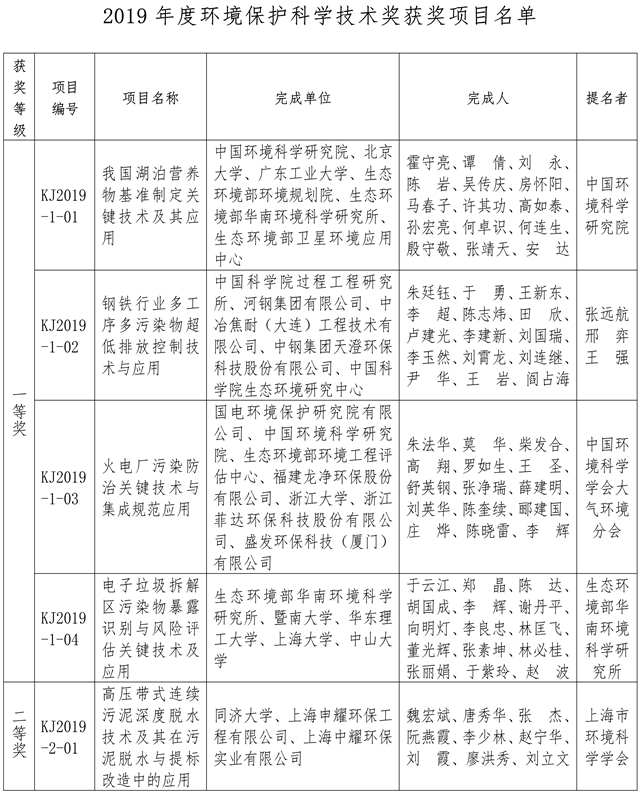 根據(jù)《環(huán)境保護科學技術獎勵辦法》的規(guī)定,經(jīng)有關專家、單位提名和專家評審,并通過廣泛公示,環(huán)境保護科學技術獎勵委員會批準39個項目獲2019年度環(huán)境保護科學技術獎,其中:一等獎4項,二等獎33項,科普類獎2項。 附:2019年度環(huán)境保護科學技術獎獲獎項目名單 環(huán)境保護科學技術獎勵辦公室 2019年12...