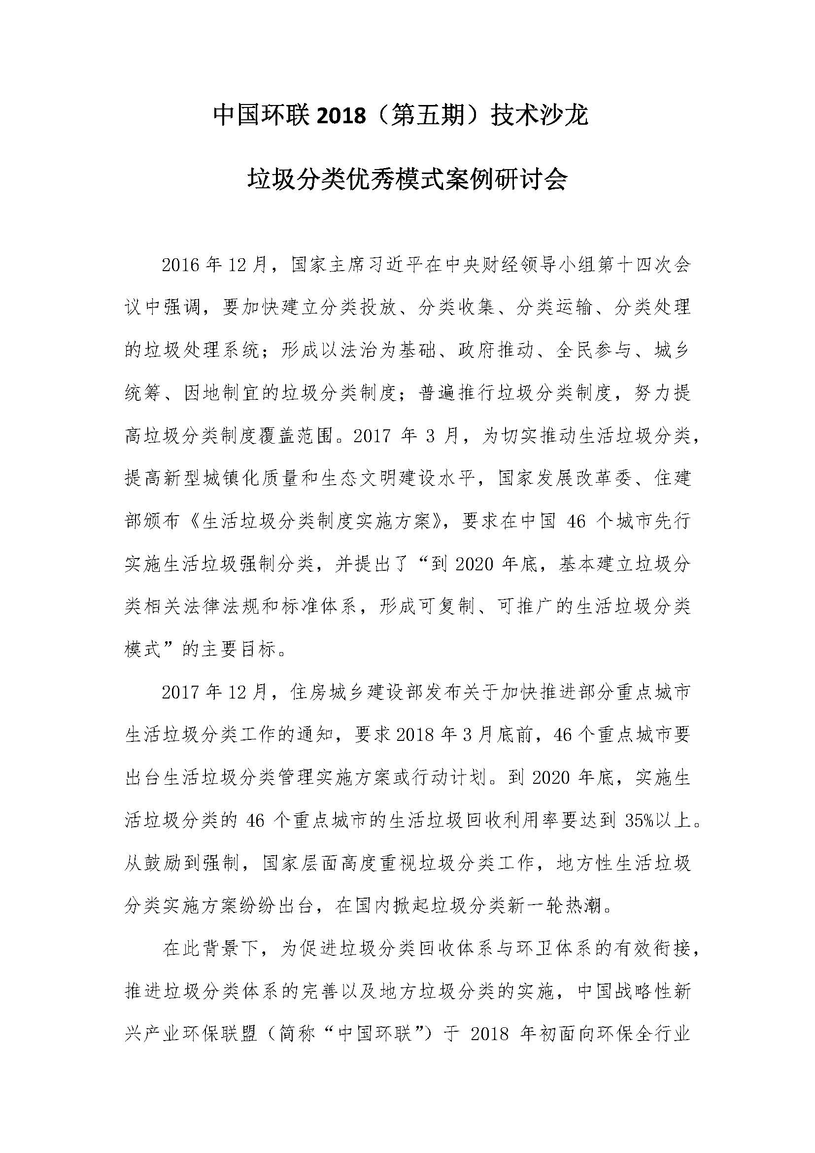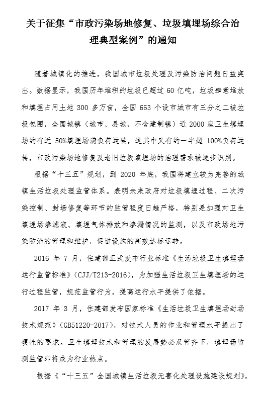 關(guān)于征集“垃圾分類優(yōu)秀模式案例”的通知2016年12月,國家主席習(xí)近平在中央財經(jīng)領(lǐng)導(dǎo)小組第十四次會議中強調(diào),要加快建立分類投放、分類收集、分類運輸、分類處理的垃圾處理系統(tǒng);形成以法治為基礎(chǔ)、政府推動、全民參與、城鄉(xiāng)統(tǒng)籌、因地制宜的垃圾分類制度;普遍推行垃圾分類制度,努力提高垃圾分類制度覆蓋范圍。20...